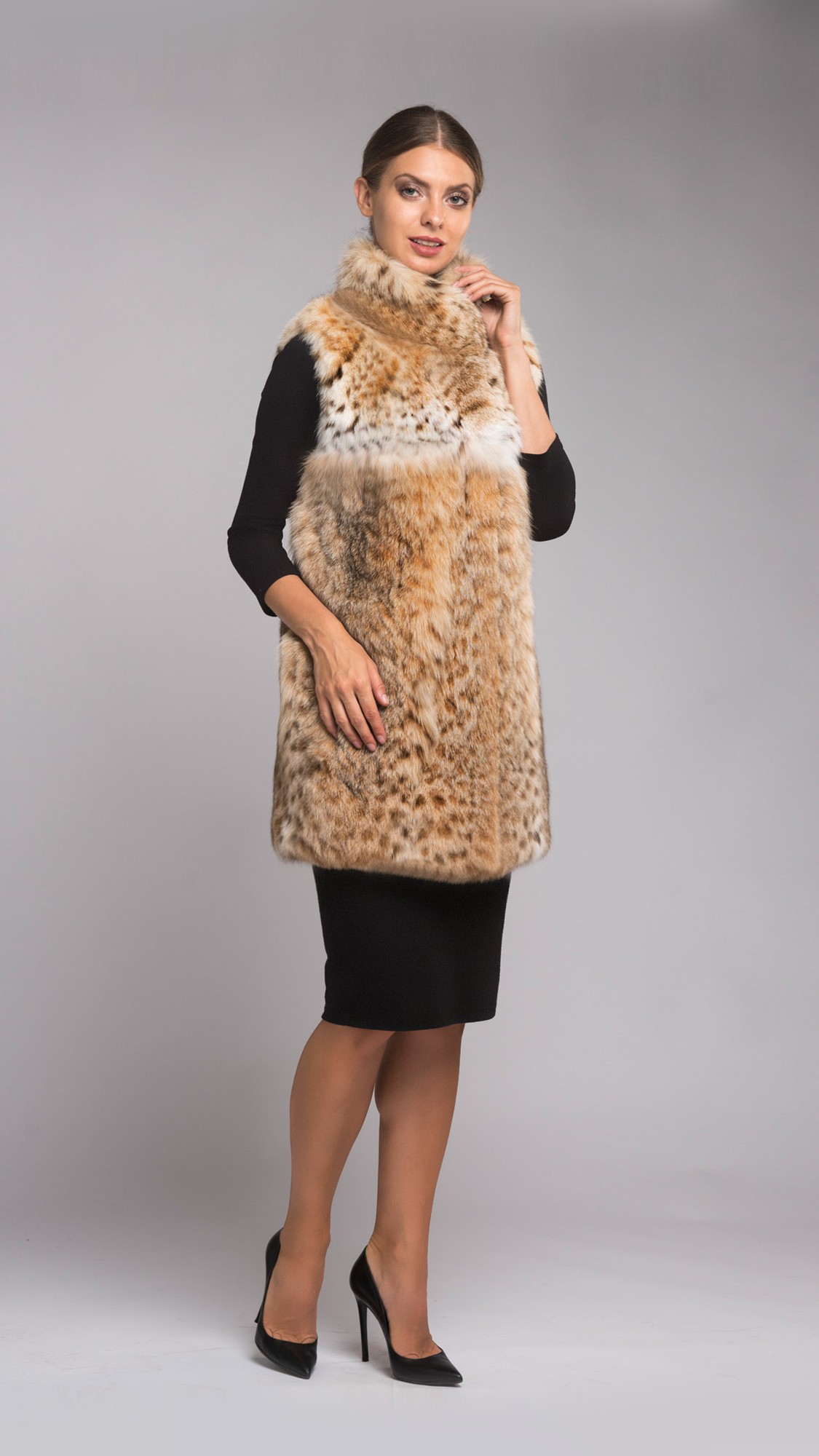 Удлиненный жилет из меха рыси очень легкий и практически невесомый, если сравнивать с другими мехами. Он густой и теплый, поэтому подойдет для тех, кто постоянно мерзнет. На ощупь рысь мягкая и пушистая. Простой и понятный крой полностью раскрывает всю красоту этого меха — от темно-рыжего до дымчатого и светлого с темно-коричневыми пятнами.